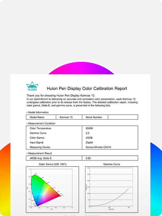 You can select sRGB, Rec.709, or Native Mode in the OSD menu[4] to create. Each Kamvas 13 (Gen 3) undergoes rigorous factory color calibration to achieve ΔE<1.5 ensuring accurate color representation. It also includes a factory calibration report[5], so you can use the correct colors to enhance your artistic expression.
